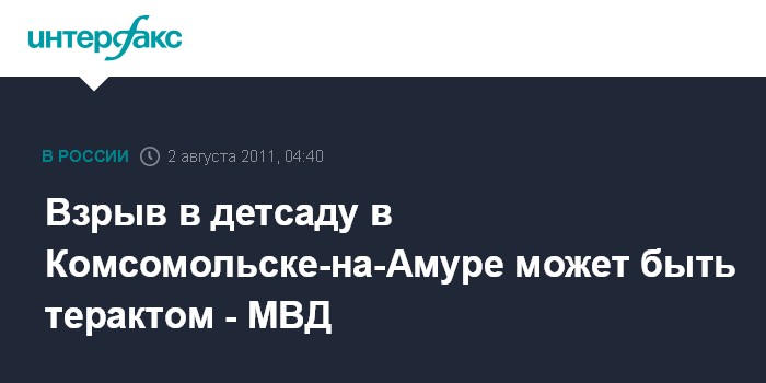 Хабаровск. 2 августа. ИНТЕРФАКС - Правоохранительные органы Хабаровского края расценивают взрыв в детском саду в Комсомольске-на-Амуре как террористический акт.