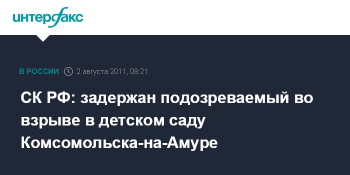 Москва. 2 августа. INTERFAX.RU - Житель Комсомольска-на-Амуре задержан по подозрению в совершении теракта в детском саду, сообщил официальный представитель СК РФ Владимир Маркин.