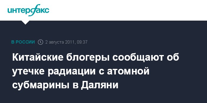 Сеул. 2 августа. INTERFAX.RU - Утечка радиоактивных веществ произошла на ультрасовременной китайской атомной подлодке, пришвартованной в порту Далянь в провинции Ляонин в северо-восточной части Китая, пишет южнокорейская газета Chosunilbo со ссылкой на информацию, появившуюся в сети.