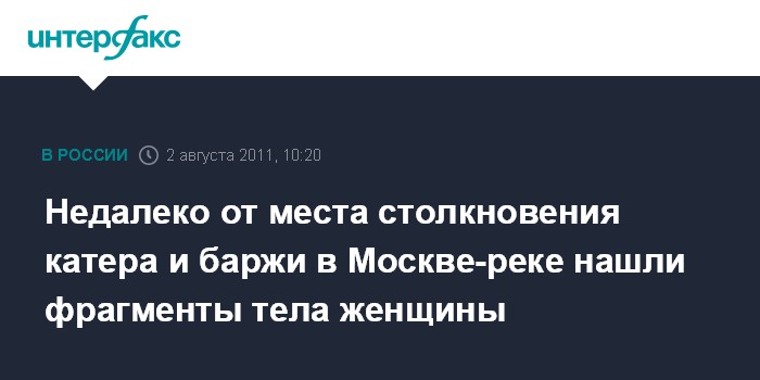 Москва. 2 августа. INTERFAX.Ru - Останки женщины обнаружены в Москве-реке в нескольких сотнях метров от места столкновения прогулочного катера и баржи 31 июля, унесшего девять жизней, сообщил "Интерфаксу" источник в правоохранительных органах.