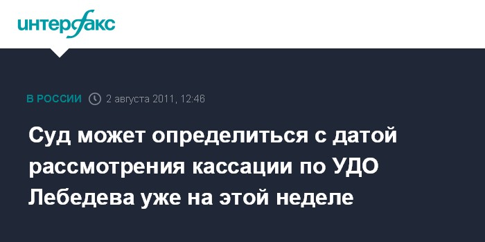 Архангельск. 2 августа. INTERFAX.RU - Суд может определиться с датой рассмотрения кассации на отказ в удовлетворении ходатайства об условно-досрочном освобождении (УДО) экс-главы МФО "Менатеп" Платона Лебедева уже на этой неделе, сообщили "Интерфаксу" во вторник в Вельском районном суде.