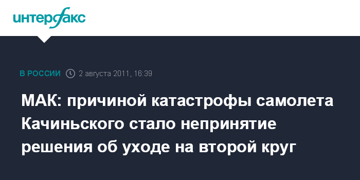 Москва. 2 августа. INTERFAX.RU - Причиной авиакатастрофы самолета президента Польши Леха Качиньского, произошедшей в апреле прошлого года под Смоленском, стало непринятие решения экипажем об уходе на запасной аэродром при наличии информации о фактической неблагоприятной погоде в Смоленске.