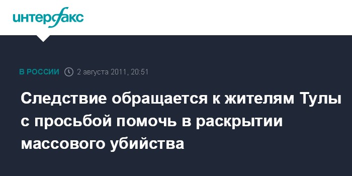 Тула. 2 августа. INTERFAX.RU - Следственные органы Тульской области обратились к жителям Тулы с просьбой предоставлять любую информацию, касающиеся убийства семьи из пяти человек.