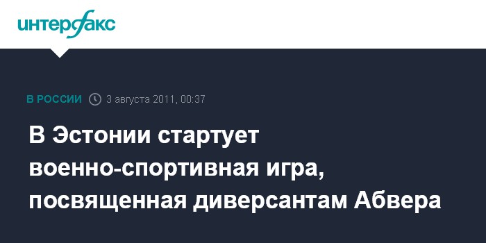 Таллин. 3 августа. ИНТЕРФАКС - В Эстонии в среду стартует международная военно-спортивная игра "Поход "Эрны" 2011", посвященная памяти эстонских диверсантов, служивших гитлеровской военной разведке Абвер.
