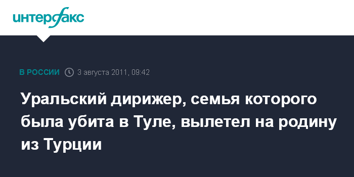Екатеринбург. 3 августа. INTERFAX.RU - Дирижер Уральского государственного оркестра народных инструментов Леонид Шкарупа, семья которого была убита в Туле, в среду прибудет из Турции в Екатеринбург.