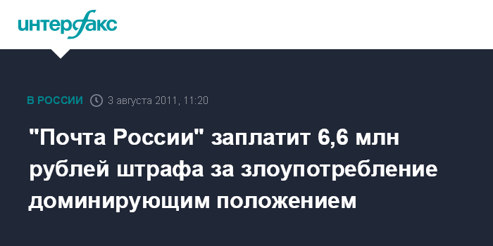 Москва. 3 августа. INTERFAX.RU - Федеральный Арбитражный суд Дальневосточного округа (ДВО) 27 июля 2011 года обязал ФГУП "Почта России" перечислить в бюджет штраф в размере 6 миллионов 559 тысяч рублей по факту злоупотребления доминирующим положением на рынке оказания услуг почтовой связи.