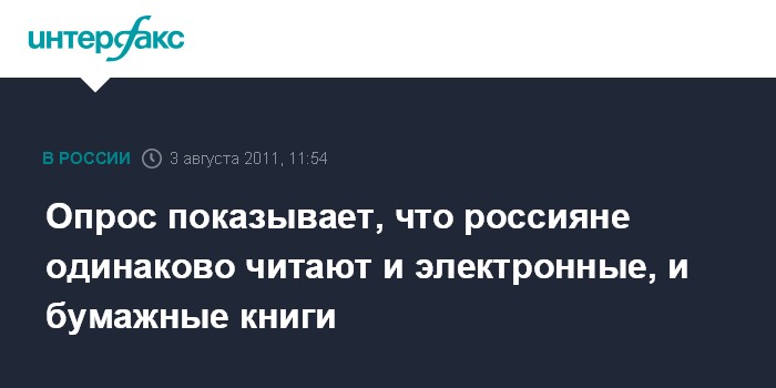 Москва. 3 августа. INTERFAX.RU - Большинство россиян (73%) по-прежнему предпочитает бумажные книги, однако их электронные устройства становятся все популярнее и уже не воспринимаются как нечто редкое и необычное, выяснили социологи портала Superjob.ru.