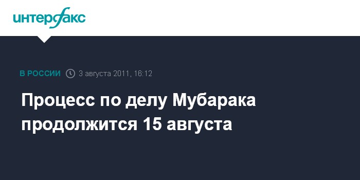 Дубай. 3 августа. INTERFAX.RU - Следующее слушание в рамках судебного процесса по делу экс-президента Египта Хосни Мубарака намечено на 15 августа, постановил в среду ведущий этот процесс судья Ахмед Рифаат. Первые слушания в рамках процесса состоялись ранее в среду в специально оборудованном зале в здании полицейской академии в Каире. Кроме Мубарака, которого доставили в зал на медицинской кушетке-каталке, на процессе в качестве обвиняемых присутствовали его сыновья Ала и Гамаль, а также бывший министр внутренних дел Египта Хабиб аль-Атли.