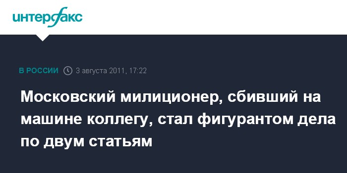 Москва. 3 августа. INTERFAX.RU - Уголовное дело в отношении милиционера, сбившего на внедорожнике на востоке Москвы пытавшегося его задержать оперативника отдела собственной безопасности, заведено по двум статьям Уголовного кодекса.