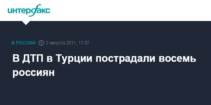 Москва. 3 августа. INTERFAX.RU - В результате ДТП, произошедшего в среду утром недалеко от турецкого курортного городка Манавгат, пострадали восемь российских туристов, сообщили в отделе по туризму посольства Турции в РФ в среду. Трое из пострадавших пока находятся в больнице, пятеро отпущены.