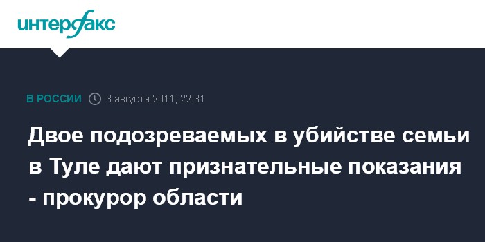 Тула. 3 августа. ИНТЕРФАКС-ЦЕНТР - Двое задержанных подозреваемых в убийстве семьи из пяти человек в Туле, дают признательные показания, сообщил журналистам в среду вечером прокурор Тульской области Олег Черныш.