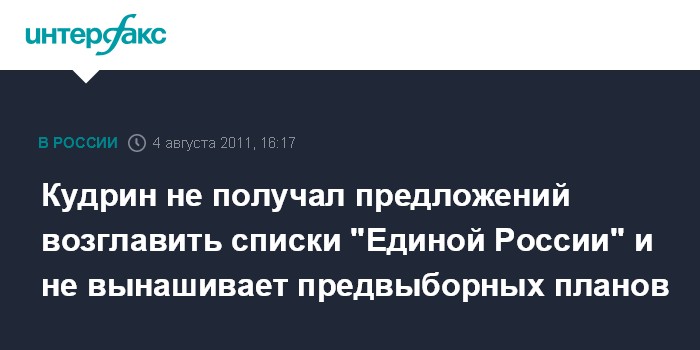 Москва. 4 августа. INTERFAX.RU - Вице-премьер, министр финансов Алексей Кудрин не получал предложений возглавить региональные списки "Единой России" в Архангельской области.