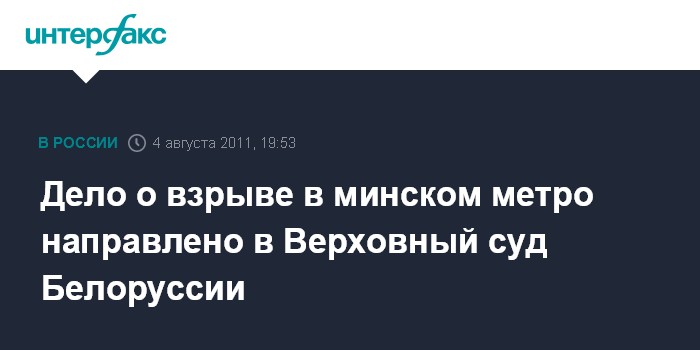 Минск. 4 августа. INTERFAX.RU - Генеральная прокуратура Белоруссии направила в Верховный суд уголовное дело о взрыве в минском метро для определения подсудности, сообщили агентству "Интерфакс-Запад" в прокуратуре республики.