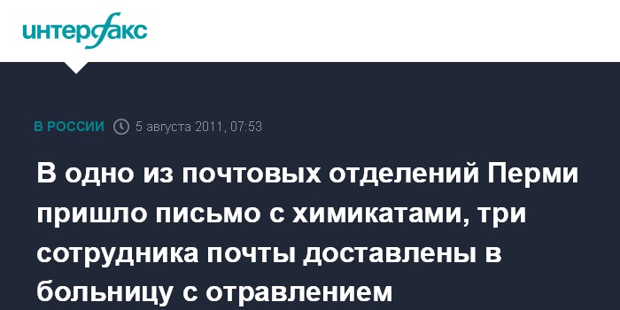 Пермь. 5 августа. ИНТЕРФАКС-ПОВОЛЖЬЕ - В почтовое отделение Перми по адресу улица Карпинского, д. 56 пришло письмо с неизвестными химикатами. Трое сотрудников почтового отделения получили отравление и были доставлены в больницу.
