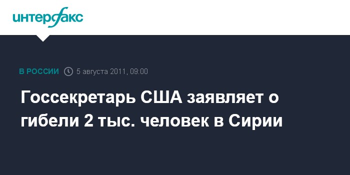 Вашингтон. 5 августа. INTERFAX.RU - Сирийское правительство несет ответственность за гибель 2 тыс. человек с начала протестов против нынешнего президента страны Башара Асада, полагает глава государственного департамента США Хиллари Клинтон. По ее мнению, Асад потерял всякую легитимность в Сирии.