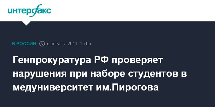 Москва.5 августа. INTERFAX.RU - Генпрокуратура России начала проверку по фактам нарушений при наборе студентов в российском национальном исследовательском медуниверситете им. Пирогова.