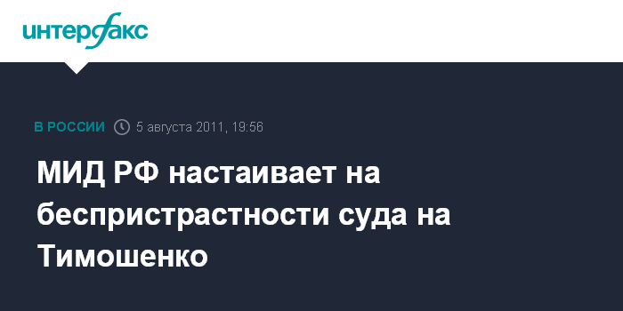 Москва. 5 августа. INTERFAX.RU - МИД России призвал Украину обеспечить беспристрастный суд над экс-премьером Юлией Тимошенко, подтвердив, что соглашения по газу в 2009 году были подписаны на основе необходимых указаний президентов РФ и Украины.