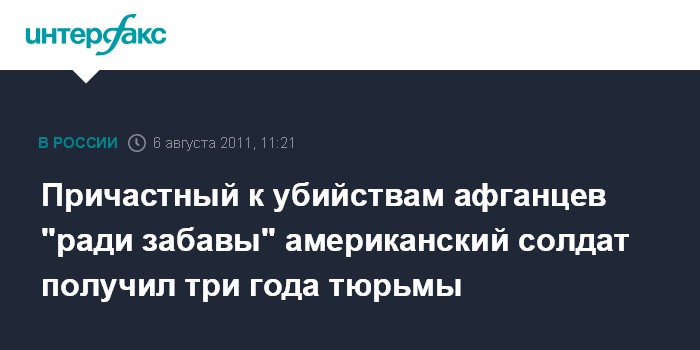 Лондон. 6 августа. INTERFAX.RU - Военнослужащий американской армии Адам Уинфилд приговорен к трем годам тюрьмы за участие в убийстве в 2010 году в Афганистане мирного жителя, сообщает в субботу британская телерадиокорпорация Би-Би-Си.