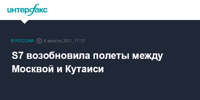 Тбилиси. 6 августа. INTERFAX.RU - Российская авиакомпания S7 Airlines, которая в параллельном режиме с грузинской Georgian Airways в настоящее время осуществляет ежедневные рейсы между Москвой и Тбилиси, в субботу возобновила полеты из российской столицы в направление Кутаиси, сообщил "Интерфаксу" представитель S7 в Грузии Паата Камараули. "Первый прямой рейс из Москвы после трехлетнего перерыва прибыл сегодня в Кутаиси в 16:50 мск. Обратный вылет намечен на 17:40 мск", - сказал он.