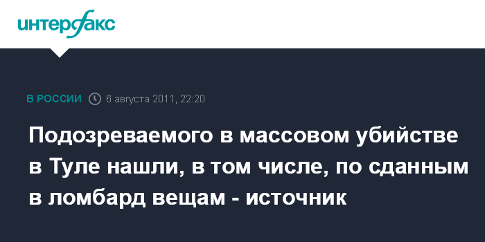 Тула. 6 августа. ИНТЕРФАКС-ЦЕНТР - Сотрудники правоохранительных органов Тульской области смогли вычислить подозреваемого в убийстве семьи из пяти человек в Туле, в том числе, по сданным в ломбард вещам, сообщил "Интерфаксу" источник в силовых структурах в субботу.