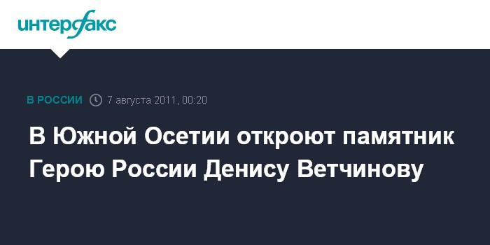 Цхинвал. 7 августа. ИНТЕРФАКС - В Южной Осетии в рамках мероприятий, приуроченных к третьей годовщине августовской войны 2008 года, откроют памятник погибшему в те дни Герою России майору Денису Ветчинову.