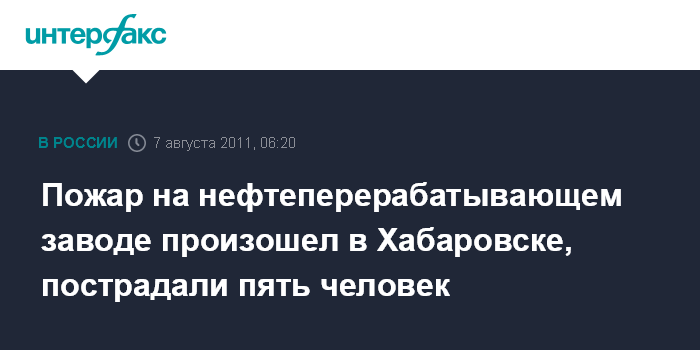 Хабаровск. 7 августа. ИНТЕРФАКС-ДАЛЬНИЙ ВОСТОК - В Хабаровске на улице Металлистов на ОАО "Хабаровский нефтеперерабатывающий завод" произошел пожар топлива и установки насосной станции на площади 50 кв. м, четыре человека находятся в реанимации, один в ожоговом отделении.