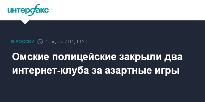 Томск. 7 августа. INTERFAX.RU - Сотрудники управления МВД по Омской области в субботу закрыли два интернет-клуба, организовавших проведение азартных игр, сообщает пресс-служба ведомства в воскресенье. "В ходе проверки выяснилось, что администраторы двух заведений в Кировском и Ленинском округах за денежное вознаграждение предоставляли клиентам доступ к интернет-сайтам с азартными играми", - говорится в пресс-релизе.