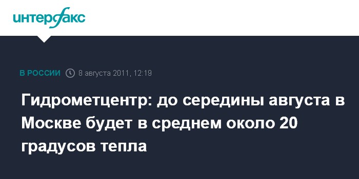 Москва. 8 августа. INTERFAX.RU - Средняя температура в Москве не превысит 20-градусной отметки до середины августа, сообщает Гидрометцентр России.