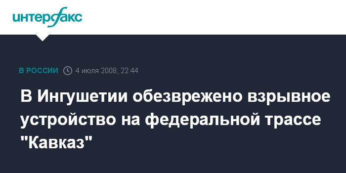 Ростов-на-Дону. 4 июля. ИНТЕРФАКС-ЮГ - В Ингушетии на федеральной трассе "Кавказ" обезврежено взрывное устройство, сообщили в пятницу агентству "Интерфакс-Юг" в штабе временной группировки войск.