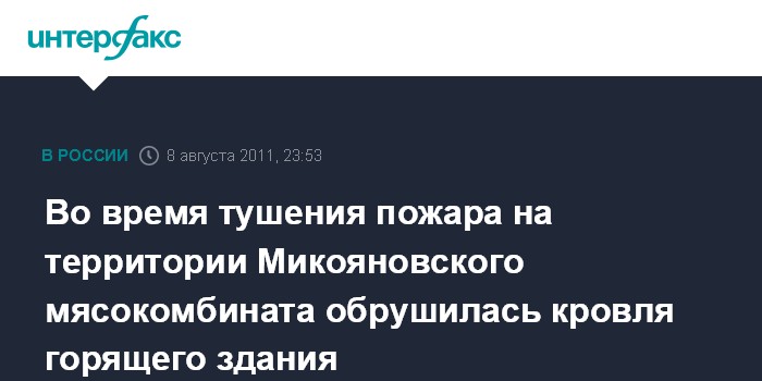 Москва. 8 августа. INTERFAX.RU - Обрушение кровли на площади 1500 кв. метров произошло в горящем здании на территории Микояновского комбината в Москве, сообщил "Интерфаксу" источник в правоохранительных органах