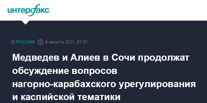 Сочи. 9 августа. ИНТЕРФАКС - Нагорно-карабахское урегулирование, ситуацию на переговорах по правовому статусу Каспия и двусторонние отношения обсудят во вторник на встрече в Сочи президент РФ Дмитрий Медведев и президент Азербайджана Ильхам Алиев.