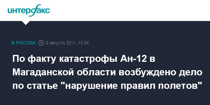 Москва. 9 августа. INTERFAX.RU - Уголовное дело возбуждено в связи с крушением самолета Ан-12 в Магаданской области, сообщил официальный представитель Следственного комитета РФ Владимир Маркин. "Дело возбуждено по статье 263 УК РФ (нарушение правил полетов и подготовки к ним)", - сказал Маркин "Интерфаксу" во вторник.