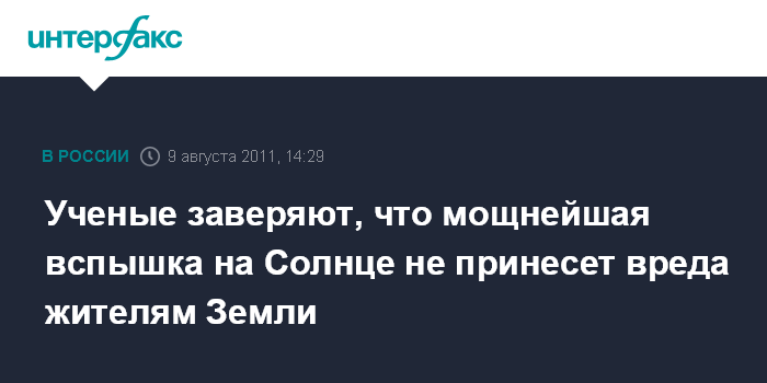 Москва. 9 августа. INTERFAX.RU – Во вторник утром на Солнце произошла мощная вспышка, подобные которой случаются крайне редко. Как сообщил Interfax.ru руководитель Центра прогнозов геофизической обстановки ИЗМИРАН Сергей Гайдаш, последний раз вспышка подобного масштаба наблюдалась в декабре 2006 года, то есть 5 лет назад. Однако эксперт посоветовал не паниковать раньше времени, поскольку данное явление не равносильно магнитной буре, при упоминании которой, россияне сразу начинают пугаться.