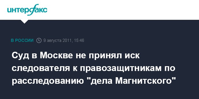 Москва. 9 августа. INTERFAX.RU - Пресненский суд Москвы отказался принять к рассмотрению иск следователя Павла Карпова, который требовал от правозащитников опровержения информации о причастности к хищению бюджетных средств в ходе расследования дела юриста фонда Hermitage Capital Сергея Магнитского, скончавшегося в СИЗО.