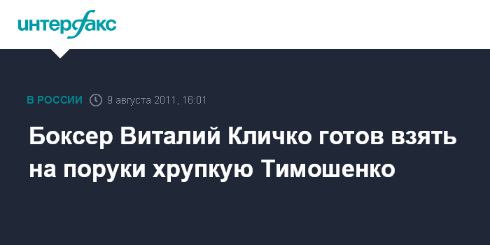 Киев. 9 августа. INTERFAX.RU - Чемпион мира, украинский боксер и лидер партии "УДАР" Виталий Кличко призывает президента Украины Виктора Януковича освободить экс-премьера Юлию Тимошенко из-под стражи, и готов взять ее на поруки.