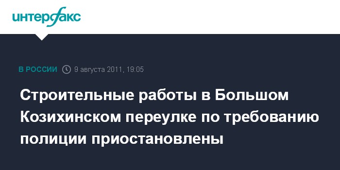 Москва. 9 августа. INTERFAX.RU - Строительные работы в Большом Козихинском переулке в центре Москвы по требованию полиции приостановлены, сообщили во вторник в пресс-службе Главного управления МВД по Москве.