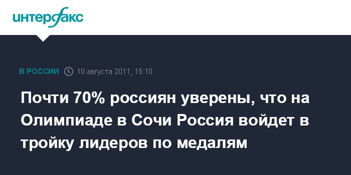 Москва. 10 августа. INTERFAX.RU - Большинство россиян (68%) считают, что национальная сборная войдет в тройку лидеров в медальном зачете по итогам Олимпийских игр в Сочи в 2014 году, причем 36% уверены, наши спортсмены займут первое место, показал опрос, проведенный исследовательским холдингом Ромир в июле.
