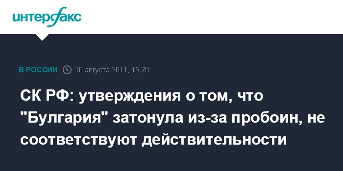 "Распространенная в СМИ информация со ссылкой на результаты освидетельствования теплохода, проведенного средневолжским филиалом Российского речного регистра, о том, что крушение "Булгарии" произошло по причине получения пробоин, не соответствует действительности", - заявил "Интерфаксу" официальный представитель СК РФ Владимир Маркин.