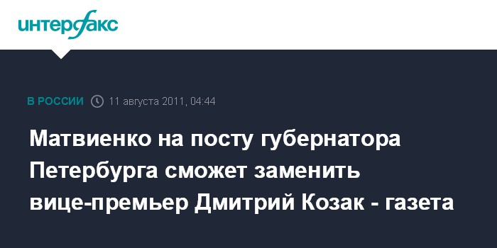 Москва. 11 августа. ИНТЕРФАКС - Наиболее вероятным кандидатом на пост губернатора Санкт-Петербурга после ухода Валентины Матвиенко в Совет Федерации называют вице-премьера Дмитрия Козака, пишет в четверг газета "Коммерсант" со ссылкой на собственные источники.