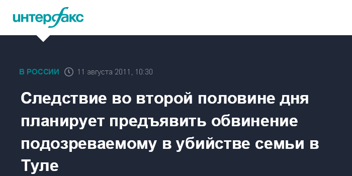 Тула. 11 августа. INTERFAX.RU - Следственные органы в четверг планируют предъявить обвинение 19-летнему жителю Тулы Ивану Иванченко, подозреваемому в убийстве семьи из пяти человек, сообщает пресс-служба СУ СКР по Тульской области. "Предъявление обвинений Иванченко может состояться уже после 15 часов", - говорится в сообщении, размещенном в четверг на сайте ведомства.