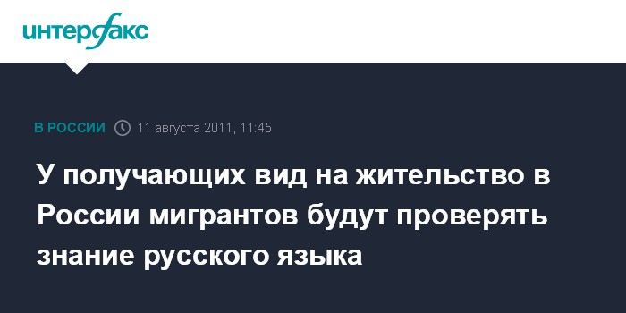 Москва. 11 августа. INTERFAX.RU - При получении вида на жительство в России будет учитываться уровень владения претендентов русским языком, заявила в ходе на пресс-конференции в центральном офисе "Интерфакса" в Москве заместитель директора ФМС Екатерина Егорова. Она пояснила, что в ближайшее время для оценки потенциальных кандидатов на получение вида на жительство в России может быть введена балльная система.
