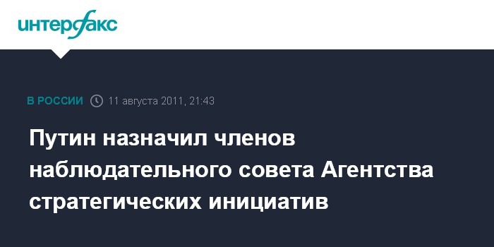 Москва. 11 августа. INTERFAX.RU - В наблюдательный совет Агентства стратегических инициатив по продвижению новых проектов вошли одиннадцать человек, среди которых политики, бизнесмены и чиновники.