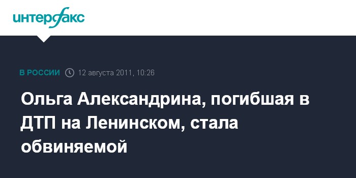 Москва. 12 августа. INTERFAX.RU - Следователи заочно предъявили обвинение Ольге Александриной, погибшей в результате ДТП на Ленинском проспекте с участием автомобиля вице-президента "ЛУКОЙЛа" Анатолия Баркова.