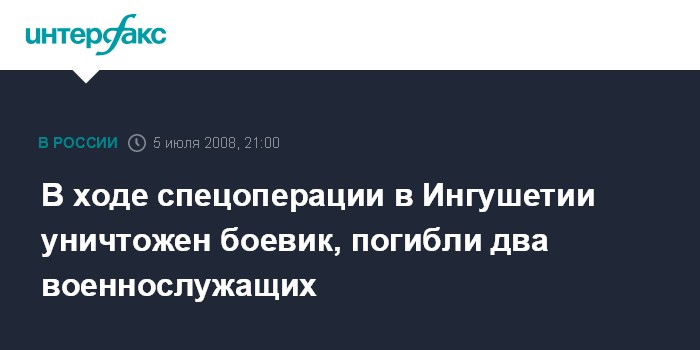 Назрань. 5 июля. ИНТЕРФАКС-ЮГ - По уточненным данным, в ходе спецоперации по задержанию группы боевиков в окрестностях селения Сагопши в Ингушетии один из них уничтожен, при этом погибли два военнослужащих.