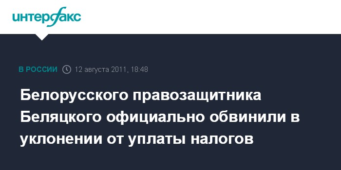 Минск. 12 августа. INTERFAX.RU - Руководителю правозащитного центра "Весна" Алесю Беляцкому официально предъявлено обвинение в уклонении от уплаты налогов в особо крупном размере, сообщила агентству "Интерфакс-Запад" правозащитник, представитель центра Татьяна Ревяко.
