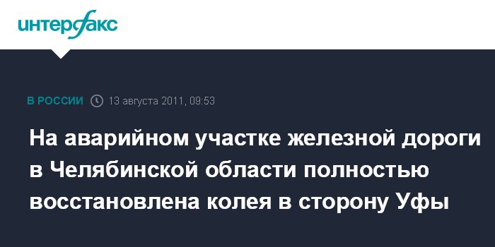 Челябинск. 13 августа. INTERFAX.RU - На участке железной дороги в Челябинской области, разрушенном в результате столкновения грузовых поездов с углем, полностью восстановлено полотно в сторону Уфы, сообщил агентству "Интерфакс-Урал" сотрудник пресс-центра ГУ МЧС РФ по региону. "По данным на 4:00 мск субботы, одна колея полностью восстановлена: и полотно, и электроснабжение. Это в сторону Уфы", - сказал собеседник агентства.