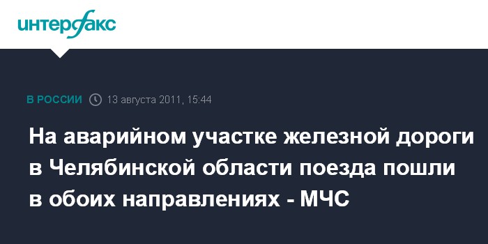 Москва. 13 августа. INTERFAX.RU - На участке железной дороги в Челябинской области, разрушенном в результате столкновения грузовых поездов с углем, полностью восстановлено движение поездов, сообщает в субботу пресс-центр ГУ МЧС РФ по региону.
