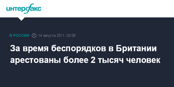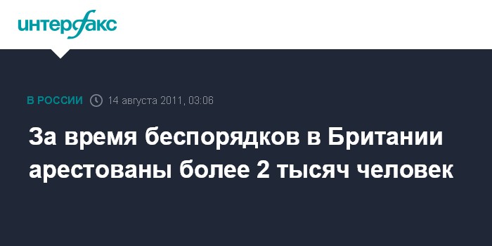 Лондон. 14 августа. ИНТЕРФАКС - Более 2 тыс. человек арестованы в Великобритании со времени начала массовых беспорядков на прошлой неделе, сообщает британская телерадиовещательная корпорация Би-би-си.