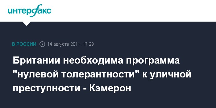 Лондон. 12 августа. INTERFAX.RU - Британские власти обещают резко пересмотреть и ужесточить свою политику в отношении уличной преступности и перейти на программу американского типа так называемой "нулевой терпимости" к участникам уличных беспорядков и мародерам. Такое заявление премьер-министр Дэвид Кэмерон сделал в интервью газете Sunday Telegraph, передает в воскресенье британская телерадиовещательная корпорация Би-би-си.
