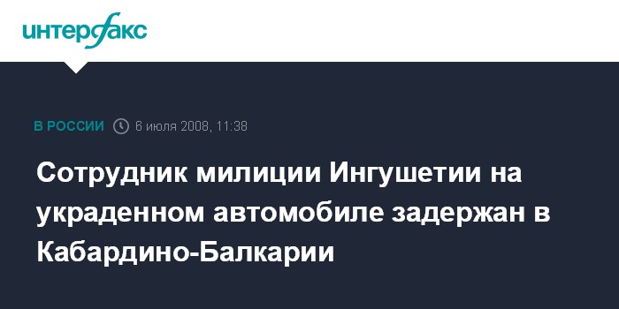 Москва. 6 июля. INTERFAX.RU - В Кабардино-Балкарии задержана угнанная машина, которой управлял сотрудник МВД Ингушетии.